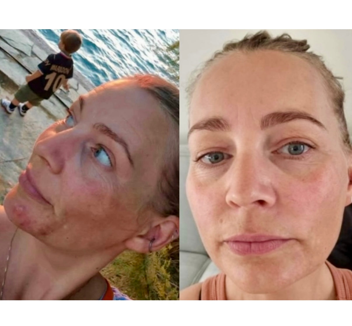 Jeg synes lige du skal se før og efter billeder. Fik jo akneproblemer som voksen, efter mit andet barn, ca 35 år. Aldrig har jeg før haft problemer med bumser. Samtidig fik jeg tør, sensitiv og eksemplaget hud. Svær kombi. Se en forskel, også på rynker ved øjnene! Det er jo vanvittigt Intet filter eller make up på billede 2. Har lidt af den dårlige hud i næsten 10år! Er SÅ lykkelig for din olie!